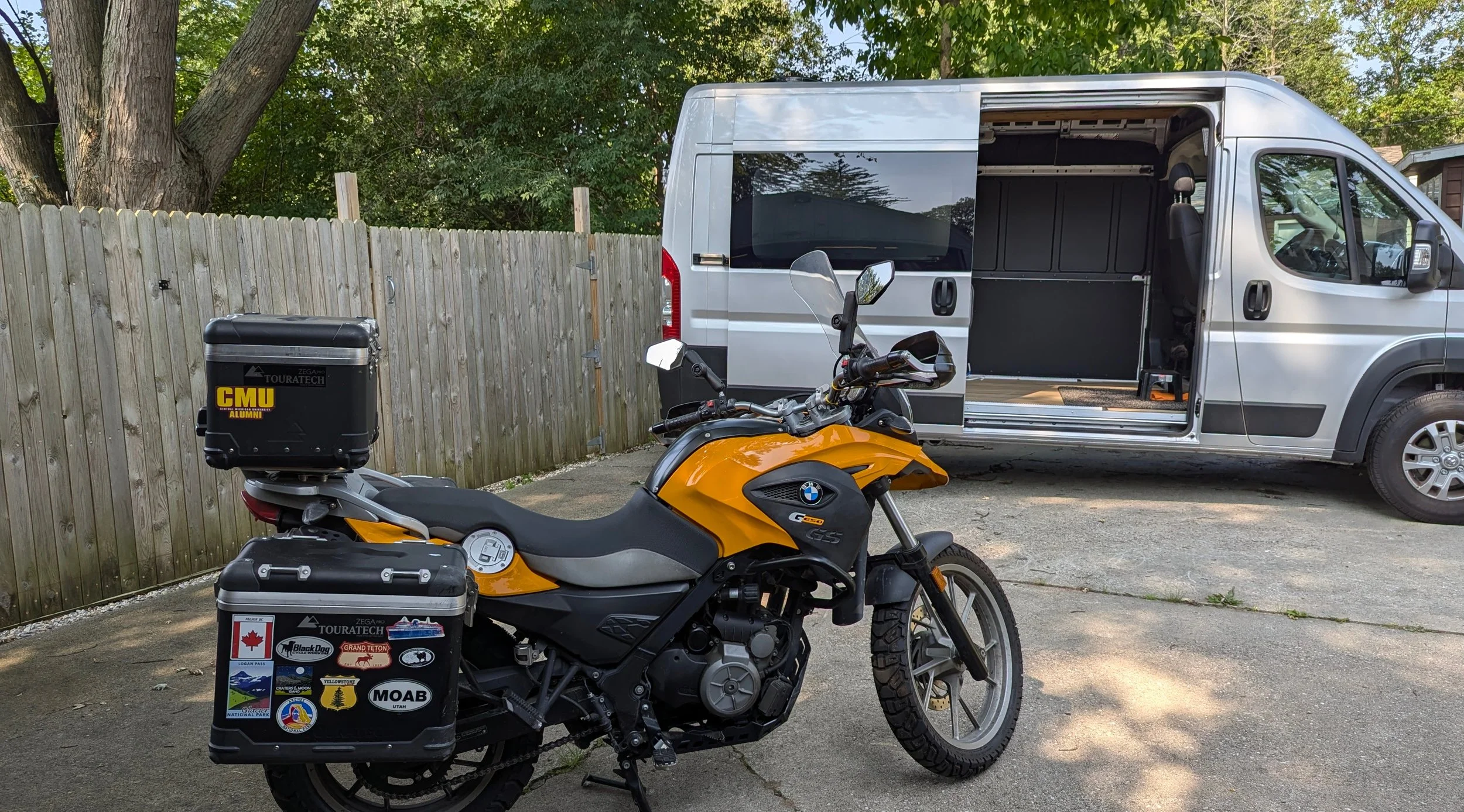 When I picked out this van, the one feature it did not have was a pre-installed hitch. That is one of the factory options that is a better deal than the aftermarket. So I am contemplating whether to add a hitch so that I could pull a motorcycle trailer. Or, maybe switch to a much smaller trail bike that could come along on trips on a bumper rack. Or what about just a hitch-mounted bike rack. Pedal-power works, too. So many options…which I think can wait until 2025. Plenty of time to over-research the options this Winter.