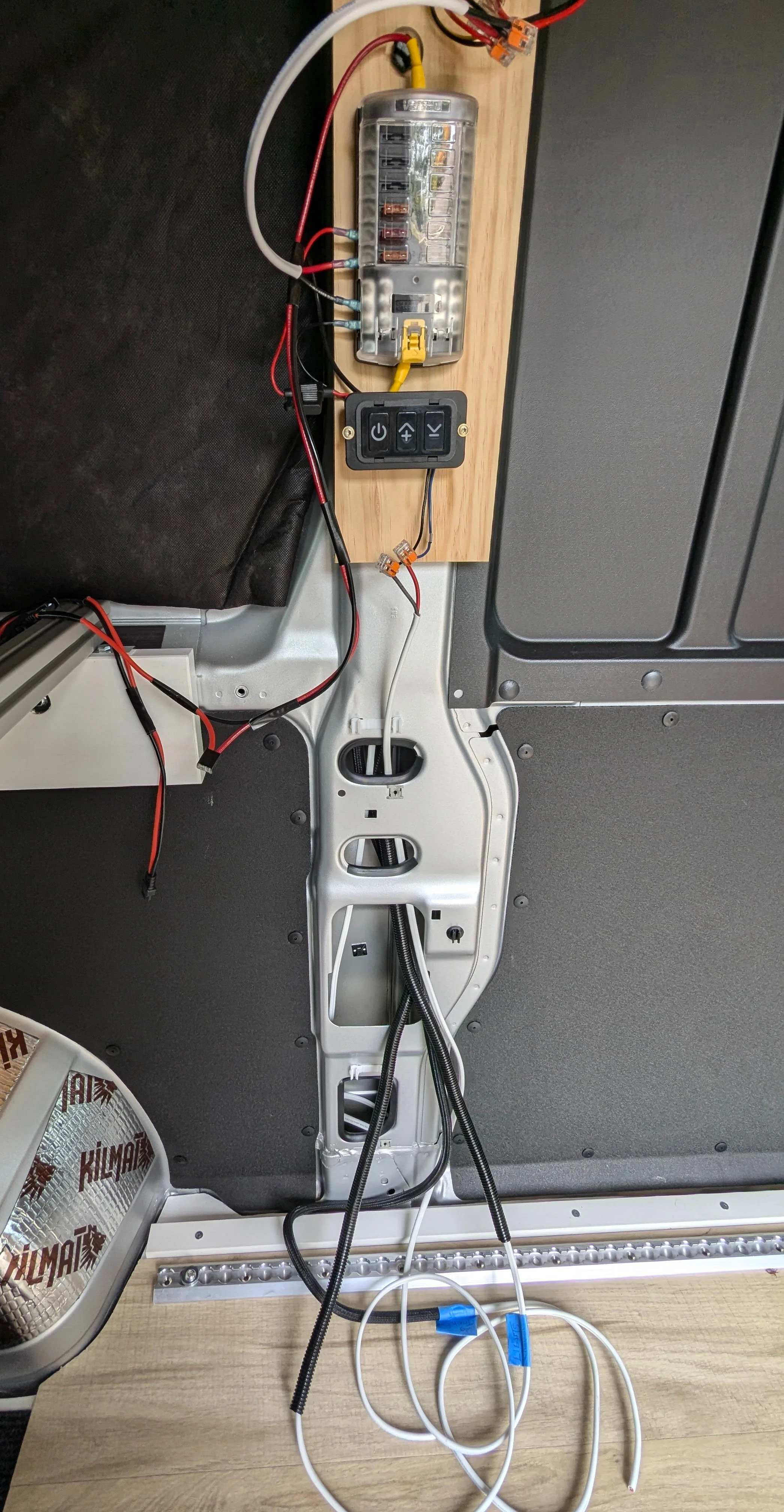 I spent some of my morning running wires into split loom while I can still access all the little nooks and crannies that the van has. This protects the wire from rubbing against any of the sharp metal ribs in the framing of the van that could cause short-circuits (or fire) down the road.