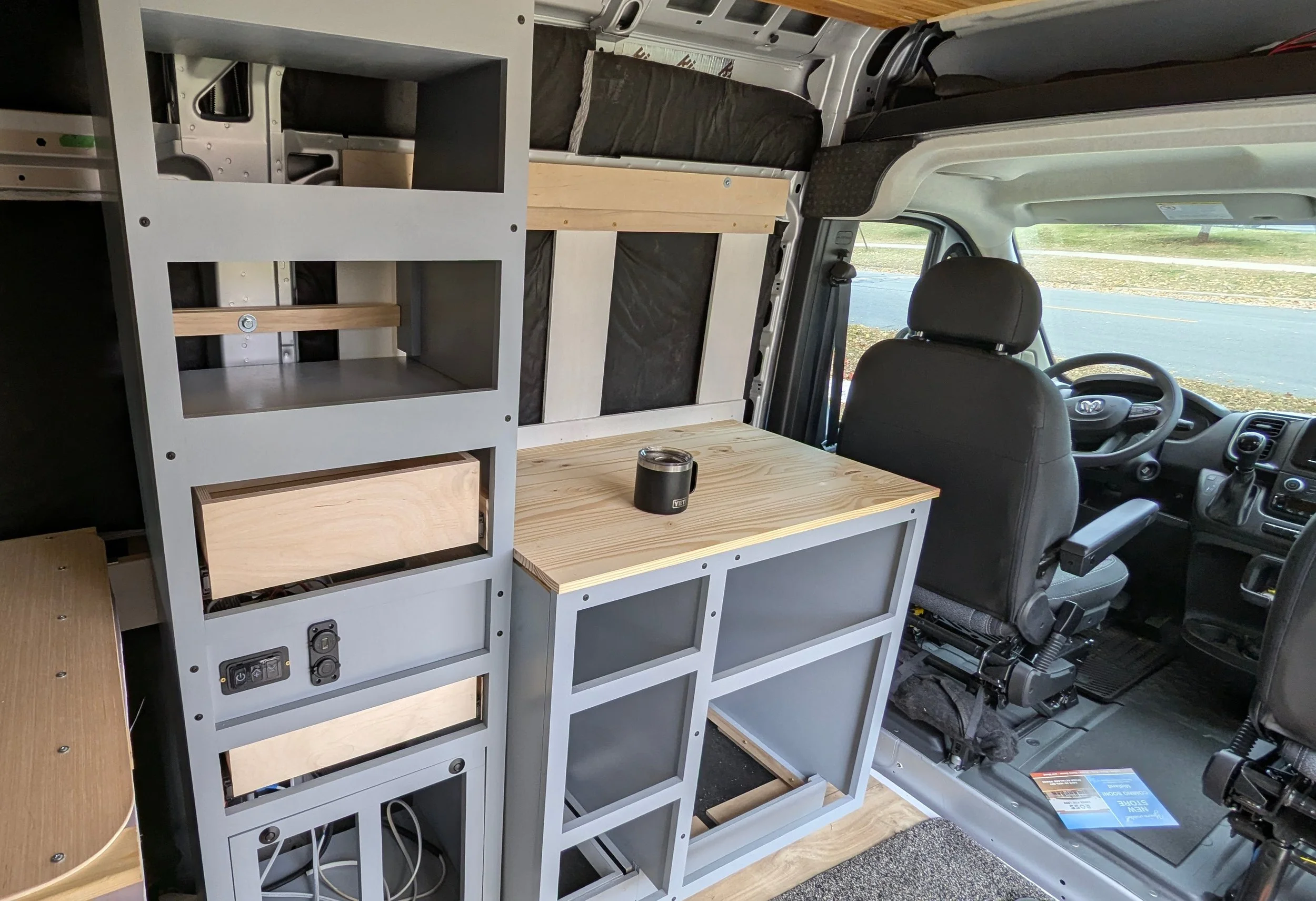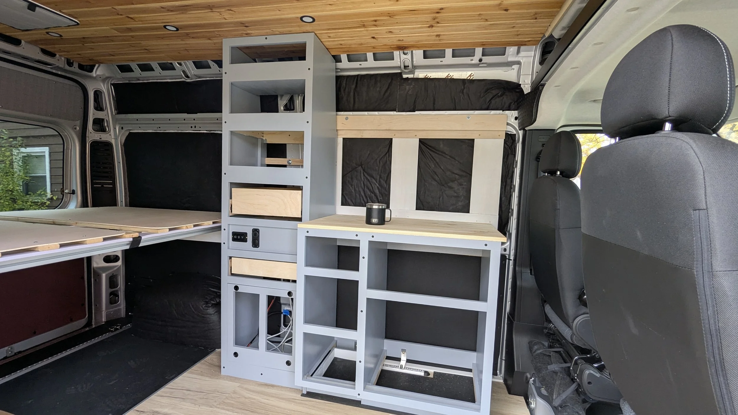 The big step for me was getting enough progress where I could finally assemble and attach the cabinets to the van and not immediately regret it. The main kitchen pedestal cabinet will have 3 sliding drawers on the left. I’m pretty sure that I’ll be able to reach into the cabinet and line up the drawer slides - although it may be a tight enough fit that new swear words could get invented.