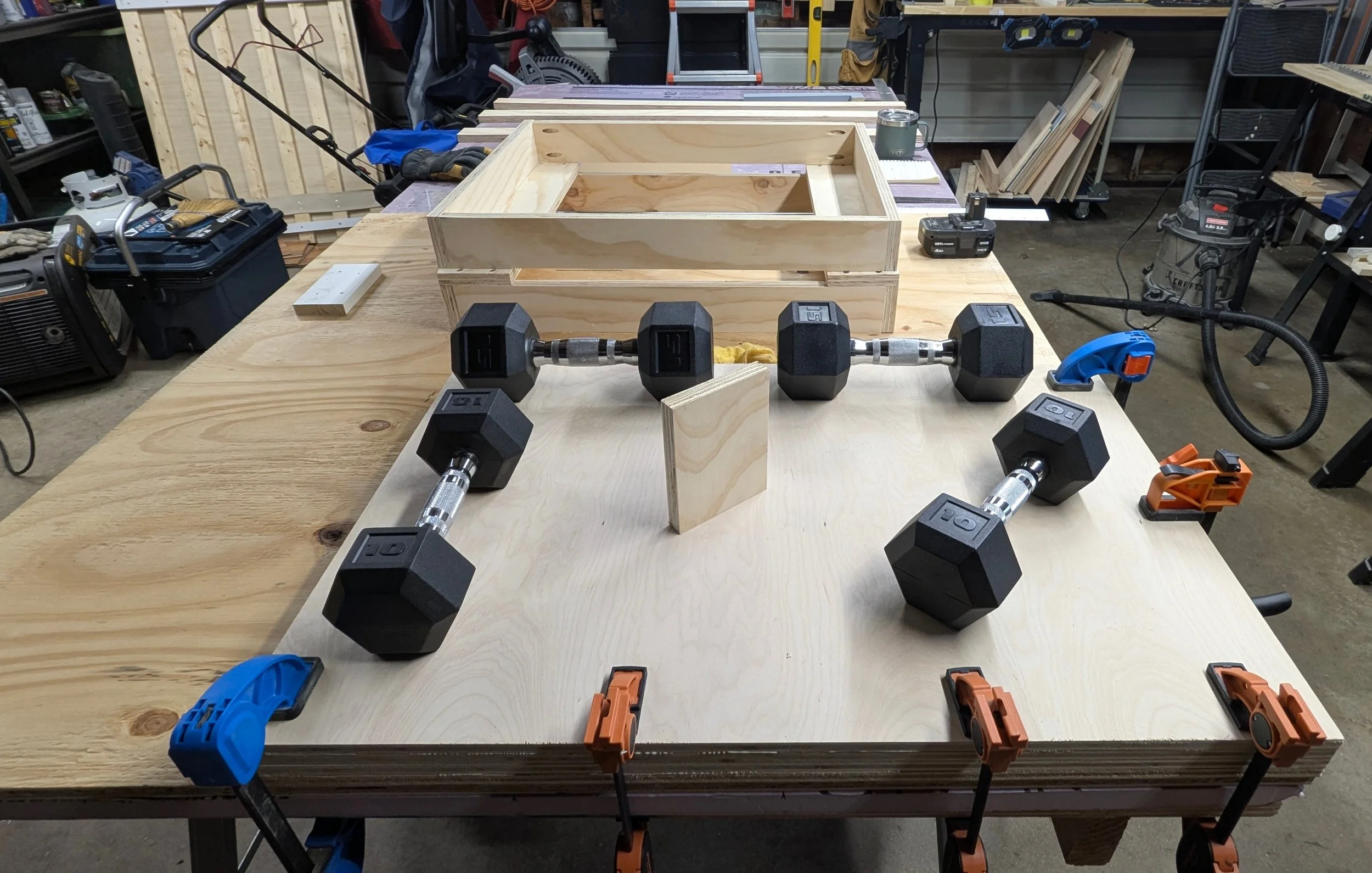 The top and bottom cabinet carcass frames are done, while the cabinets side panels are glued and being pressed together. I used two 1/2” sheets for each side so the cabinet will be sturdy. I learned from previous cabinets that the 1/2” plywood is too thin by itself to attach materials to, hold screws well and resist warping.