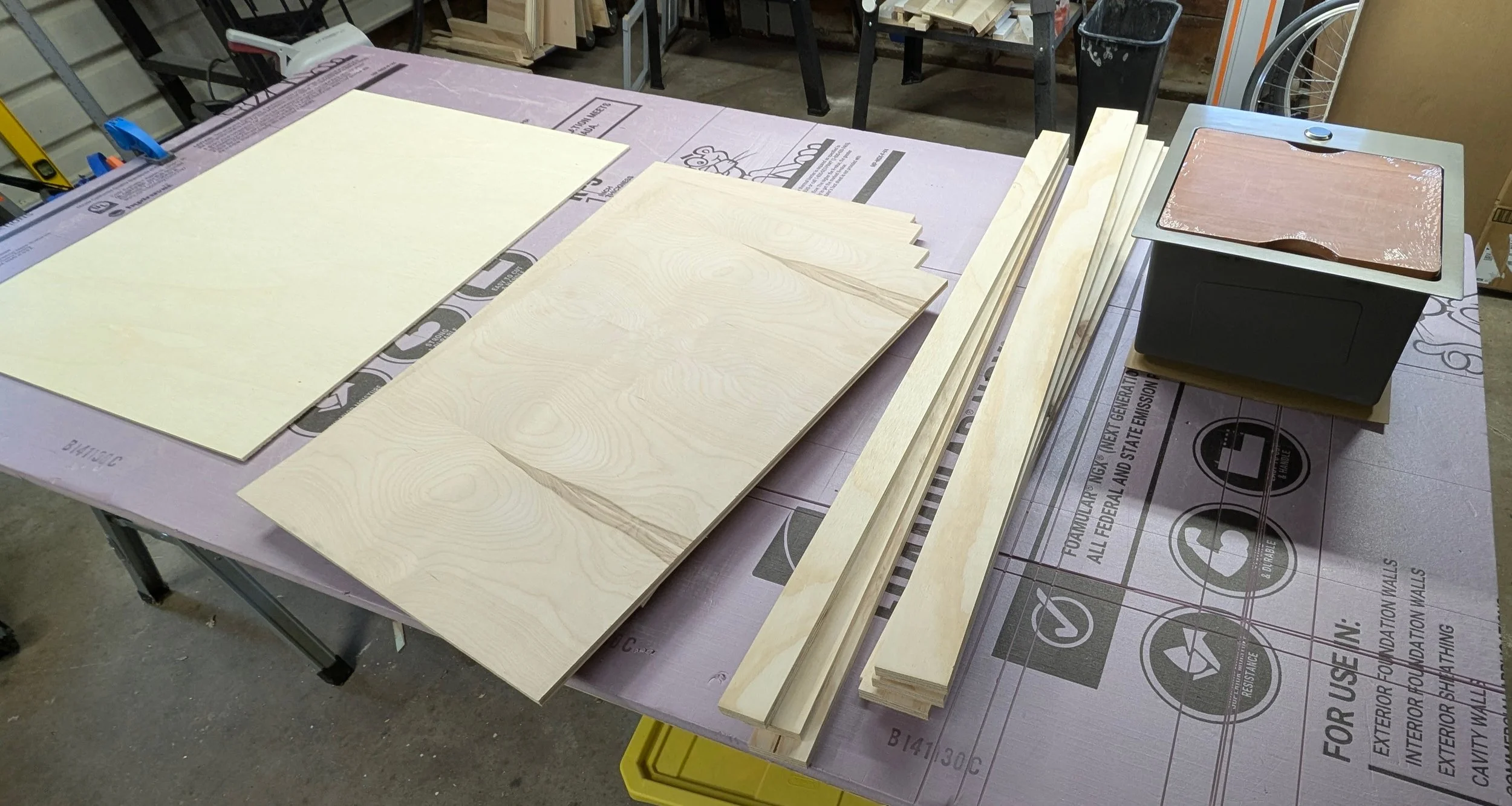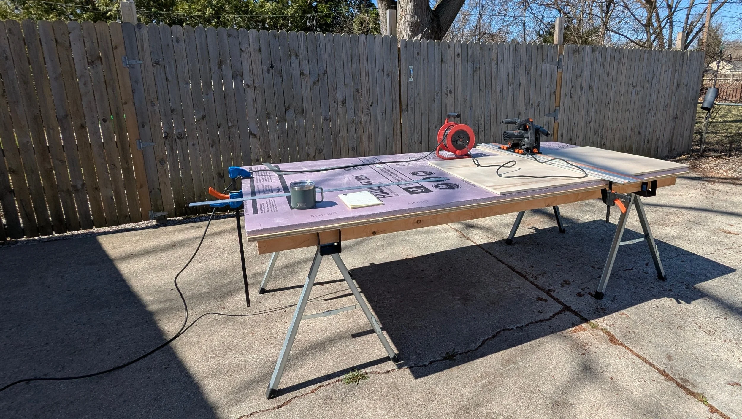 Sometimes things line up. A day off + nice weather + new supply of lumber means I will get something done. I moved my working platform outside, since the goal today was to cut all the plywood down to small pieces needed for the next cabinet project.